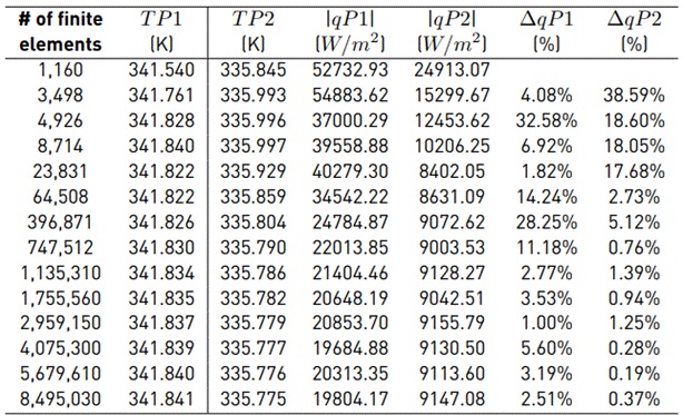 The convergence in the heat flux at each point of reference requires finer meshes than in the case of temperature, mainly for two reasons. First, for Case A, first-order tetrahedral finite elements are used, and second, the dimensions of the pin fin heat sink are such that a finer mesh is needed to avoid the effect of the singularities on the edges. To demonstrate this effect, Table 3 presents the heat flux at the two selected points in such a way that the convergence of the heat flux in P2 is more stable (monotonic) than that in P1. In the case of modeling validation problems (for direct comparison with experimental or analytical results), a more appropriate strategy would be to use a coarse mesh that guarantees convergence in P2 and then perform refinement located near P1 . An additional example where this type of modeling might be required is in optimization problems, in which the local gradient is used as a metric to guide the optimization of the objective function [27].