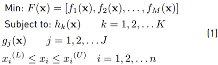 where, F (x) represents the vector of the M objective functions to be optimized. x = (x1 , X1 , . . . xn ) is a solution with n design variables. hk(x) and gj(x) are the equality and inequality constraints. xi(L) and xj(U) are the boundary limits of the decision variable xi . In the following, the fundamental concepts in multiobjective optimization are addressed.