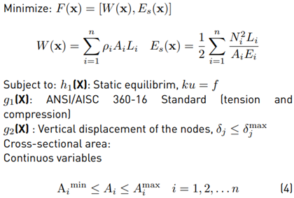Many truss topology optimization studies reported are single objective function (mainly minimizing weight) small-scale benchmark problems (SOSS problems) and are based on applying metaheuristic algorithms as optimization methods. In order to solve SOSS problems, Hybrid Genetic Programming (HGP) [11], Heat Transfer Search (HTS) [12], Firefly Algorithm (FA) [15], Search Group Algorithm (SGA) [16] and Passing Vehicle Search Simulated Annealing (PVS-SA) [17] have been used. For multiobjective topology optimization small scale problems (MOSS problems), the studies mainly consider the simultaneous minimization of the structural weight and the maximum displacement of the nodes as objective functions: Multiobjective Genetic Algorithm (MOGA) [18], Multiobjective Adaptive Symbiotic Organisms Search (MOASOS) [19] and Multiobjective Uniform Genetic Programming (MUGP) [20].