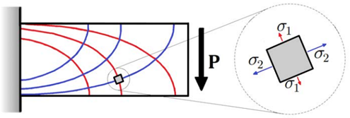 Stress trajectories are tangential lines in the direction defined by the principal stresses at each point of the design domain. For plane stress (σx , σy and τxy ), the principal stresses σ1 and σ2 produce two stress trajectories that form an orthogonal network composed of shear-free lines. These trajectories are very useful to understand the load paths (how external loads move through the structure to the supports), provide information related to how the flow of the principal stresses occurs in the plane of analysis, and are related to structural optimization [43,44]. The direction of the principal stresses can be obtained by applying the stress transformation equations at each point of the design domain, given the numerical information of the plane stress state (for a continuous arbitrary design domain, it can be determined using the finite element method). Figure 1 schematically shows the stress trajectories distribution for a cantilever beam with a point load at the free end.
