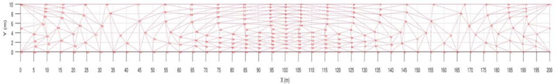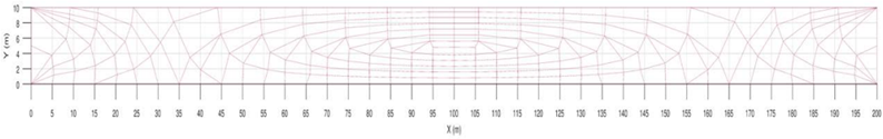 From the stress state numerical information, the stress trajectories σ1 (red) and σ2 (blue) were calculated in MATLAB®, as shown in Figure 8. The parameters used to calibrate the numerical method [41] were: IDW method as stress state interpolation technique, initial iteration point P = (10.0) m, step size r = 100mm and trajectory separation value a=1m.
