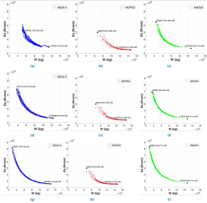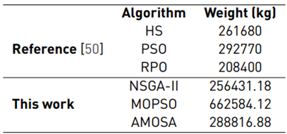 The optimization algorithms (NSGA-II, MOPSO and AMOSA) were able to solve the large-scale problem with reasonable computation times, obtaining solutions (Pareto fronts) that satisfy the mathematical formulation. This shows their ability to solve complex optimization problems involving a large number of variables and constraints defined by the design specifications. The obtained solutions were compared with the consulted reference (with only a single objective function, the weight), showing results close to the specialized algorithms in single-objective problems, even when starting (in this study) from an unknown geometry.