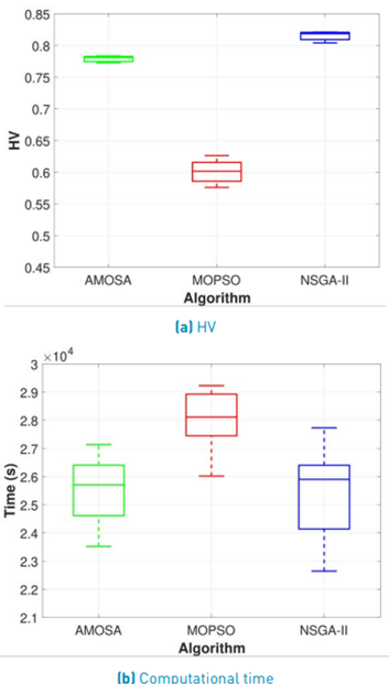 The quantitative performance results of the NSGA-II, MOPSO and AMOSA algorithms using the HV metric are presented in Figure 13a (using boxplots). The computational cost in seconds is shown in graphically in Figure 13b (using boxplots). The results were calculated for each of the five runs for iteration 1000, where the best solutions were obtained.