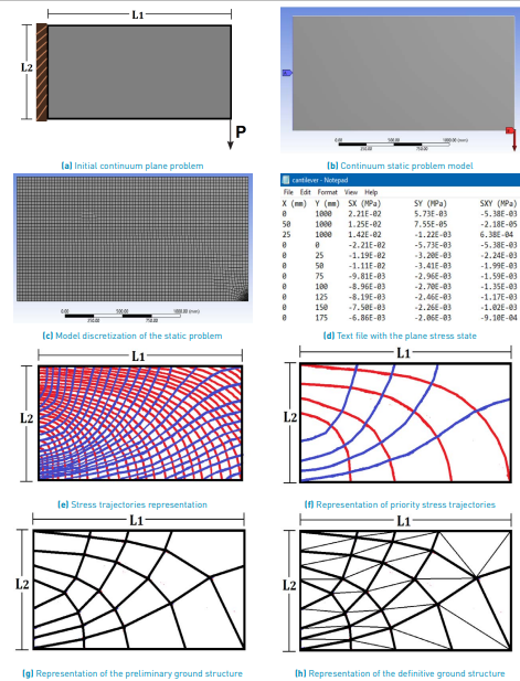 The static problem is solved using ANSYS® considering a homogeneous, isotropic material with elastic properties (see Figure 2b). A text file (.txt) (see Figure 2d) with the numerical information of the plane stress state (σx, σy and τxy ) associated with the design domain discretization in Figure 2c is obtained.
