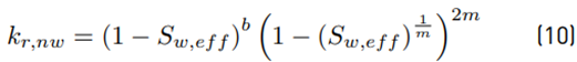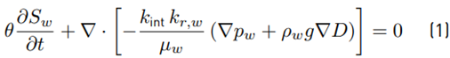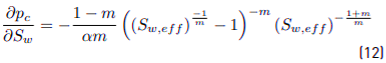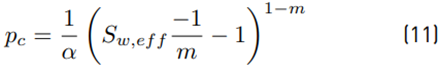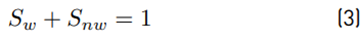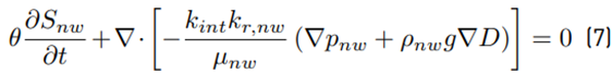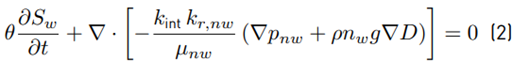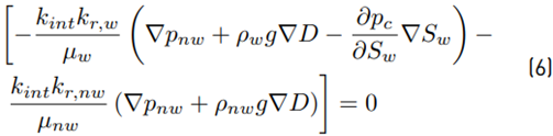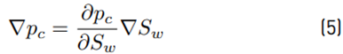 The above expressions simplify Equations (1) and (2) by eliminating two unknowns, and the conservation of mass equation of the pore fluid is then only dependent on pnw and Snw . Since capillary pressure is governed by Sw , the capillary term, ∇pc , can be expressed as: