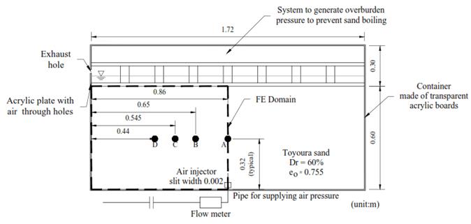 Yasuhara et al. [15] carried out an experimental program to induce, by means of air injection, a partial degree of saturation in a fully saturated soil column. He also conducted a numerical analysis to validate the experimental results. Nominal flow rates and the induced partial degree of saturation were recorded. Figure 1 shows a sketch of the acrylic box and instrumentation set-up implemented to conduct the desaturation process. It consists of a transparent acrylic box 1.72 m long, 0.90 m high, and 0.60 m width containing a fully saturated homogeneous column test of Toyoura Sand with Dr=60 % and e0=0.755. The test was developed under conditions that allowed a) flow of water and air at the top of the column, b) a hydrostatic pressure distribution for the initial wetting phase, and c) air injection into the saturated soil medium throughout an inlet port placed at the centre-bottom of the box.