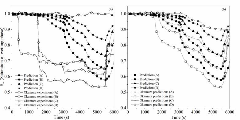 Figure 2 shows the comparison between the experimental and numerical results from Yasuhara et al. [15] with the proposed numerical analysis for changes in the degree of saturation of the wetting phases (Sw ). Locations A, B, C, and D have coordinates (xandy) inside the domain equal to (0.86,0.32), (0.65,0.32), (0.545,0.32) and (0.44,0.32), respectively. A significant discrepancy between the experimental results and both numerical analyses (i.e., the proposed approach and Yasuhara’s numerical formulation) is observed. Yasuhara et al. [15] addressed these discrepancies and they were mainly attributed to differences between the real and measured soil physical properties (e.g., permeabilities and the soil-water characteristic curve) and the equations that represent the phenomena. On the other hand, and as presented in Figure 2b, the comparison between the numerical results shows a good agreement.