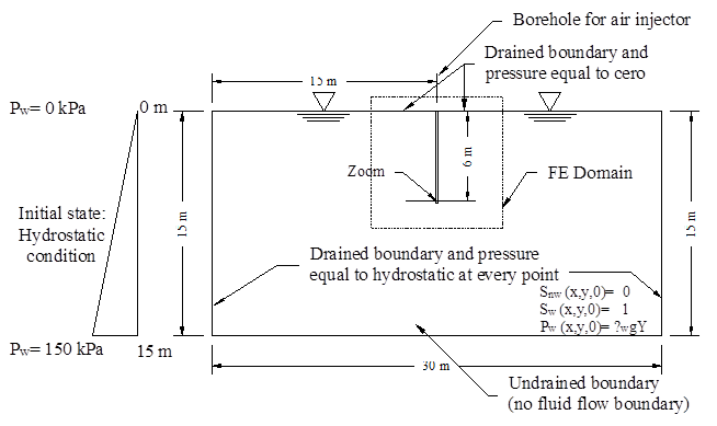 Table 4 shows the values used for the physical properties of both air and water. Data from Chen et al. [23]. Figure 3 depicts the FE model domain used for analysis. The model consists of a homogeneous soil with dimensions of 30m in width and 15m in depth. For the non-wetting phase, a no-flow boundary condition is assigned to the bottom of the model and to the borehole for air injection. A non-wetting flow is allowed to the rest of the boundaries as well as to the point where the injector is located (i.e., 6.0 m). The simulations began from a fully wetting phase condition (i.e., saturated condition), and the non-wetting phase began to flow as the pressure generated at the injector overcomes the hydrostatic pressure. The isocountors presented in all of the following figures correspond to de advance of the no wetting phase (Snw), and they are generated from a fixed zoom with an 8.8 m square shape. The left lower edge of the zoom is located at coordinates x= 10.6 m and y= 7.2 m. Figure 3 encloses, with dashed lines, the square area associated with the zoom.