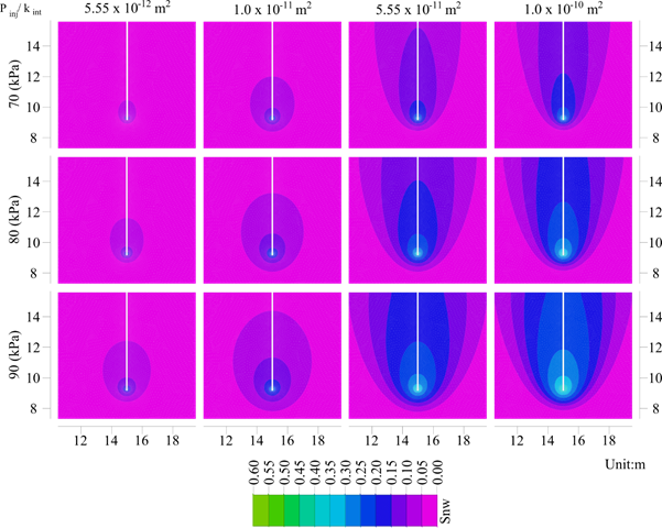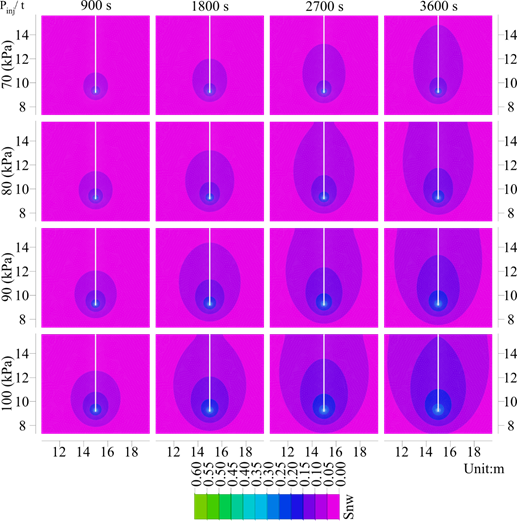 Figure 4 shows the time-space variation of Snw as a function of injection pressure and for injection times from 900 s to 3,600 s for the underlined values listed in Table 2. In total, six injection pressures were implemented for analysis, but only four are presented for the sake of simplicity.