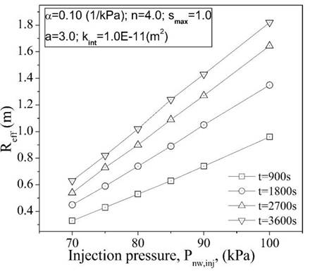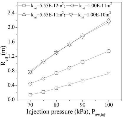 For a fixed intrinsic permeability, kint= 1.00x10-11m2 , Reff increases by a factor of 2.89 when the injection pressure increases from 70 to 100 kPa, highlighting the importance of the magnitude of injection pressure on the extent of the desaturation zone.
