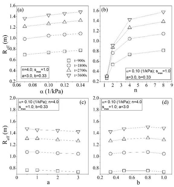 Figure 6 shows the influence of material parameters α, n, a, and b on the predicted Reff . For a constant permeability and injection pressure, material parameters α and n (van Genuchten parameters) have a more significant influence than parameters a and b (Shape parameters) on Reff . For the case of parameter α, Reff slightly increases as α increases. This response is anticipated since higher values of parameter α represent coarse-grained soils (sands). On the other hand, material parameter n has a more complex influence (nonlinear response) on the extent to which the material is partially desaturated. Initially, and for the same injection pressure and permeability, Reff remains almost constant with time when n=1.3 and it grows very rapidly when n increases from 1.3 to 2.0. For values of n between 2.0 and 4.0, Reff still increases but at a slightly slower rate. Similar behaviour is observed when n increases from 4.0 to 8.0 but with a tendency to become constant as n increases. Higher values of n (sands) represent a more rapid transition between saturated and unsaturated conditions. Material parameters a and b do not have a significant influence on the partial degree of saturation achieved during air injection. Table 5 summarizes the results of Reff for the first set of simulations. The values are taken at t=3,600 s. Reff/R0 corresponds to the ratio between the calculated effective radius of the variable being considered and the effective radius of the first assumed value (underlined in Table 5]. The numerical results show some general trends in the value of Reff that could potentially be used to develop soil desaturation methodologies. For instance, and for practical purposes, higher values of Reff are reflected in greater separation between the injection wells during a soil desaturation process.
