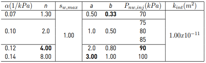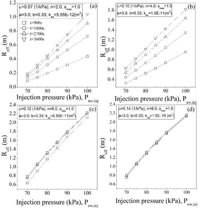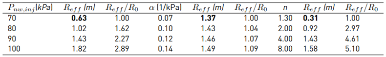 It is observed that for a particular injection pressure, the more permeable the soil, the greater the nw phase front infiltration; in other words, the greater the advance of the desaturation plume within the saturated soil medium. For the most permeable soils, kint = 5.55x10- 11 m2 and 1.00x10- 10 m2 , the increase in Reff is more pronounced as pressure increases. Both soils experience a similar effective radius regardless of the injection pressure, indicating that for a given pressure and as the soil’s intrinsic permeability increases, there exists a threshold value for Reff .