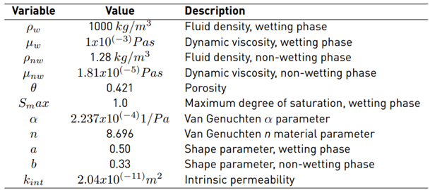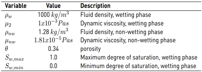 Where θ is the total porosity; Si is the degree of saturation; t is time; kint is the intrinsic permeability of the material (m2 ); kr,i is the relative permeability associated to the fluid i; μi is the fluid’s dynamic viscosity (Pa s); pi is the fluid pressure (Pa); ρi is the fluid density (kg/m3 ); g is the acceleration of gravity; and D is the coordinate of vertical elevation (m). In these definitions, subscript i= w for the wetting phase and i= nw for the non-wetting phase. The saturation of the phases can be expressed by the following constitutive expression: