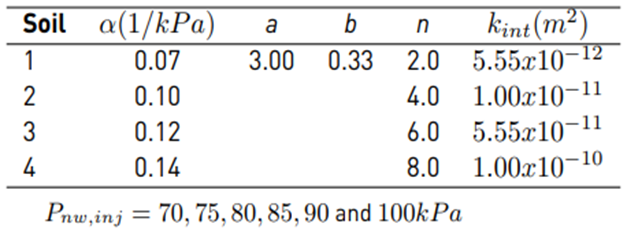 This parametric study is conducted to evaluate the influence of the hydraulic parameters (α, n, a, and b) and injection pressures on Reff . The hydraulic parameters were selected from Lu and Likos [22], and they are listed in Tables 2 and 3. These parameters are considered representative of sands and silty sand soils. In Table 2, underlined values are kept invariant while a group of predictions is generated. For instance, to study the influence of parameter n, the underlined values of α=0.10 1⁄kPa, sw,max=1.0, a=3.0, b=0.33, kint= 1.00x10-11m2 , and Pnw,inj=90 kPa are kept constant while varying n. The same approach is conducted to study the influence of the other parameters. A second group of simulations is conducted on four different soil types and analysed for air injection pressures varying from 70 to 100 kPa [Table 3]. Material parameters listed in Table 3 are representative of different silty sands (α = 0.07 1/kPa and n=2.0; 0.10 1/kPa and n =4.0) and sandy soils (α =0.12 1/kPa and n =6.0; 0.14 1/kPa and n =8.0). Each soil in Table 3 has an associated intrinsic permeability and hydraulic parameters that are dependent only on the pore size, pore geometry, and pore size distribution. Intrinsic permeability is identical for any soil regardless of the type of characteristics of the fluid being conducted on the assumption that the pore structure remains unaltered. Note that intrinsic permeability can fluctuate several orders of magnitude for the same nominal soil type; consequently, a range of intrinsic permeability values was selected to represent a variety of pervious and semi-pervious soils ranging from clean to very fine sands with high silt content.