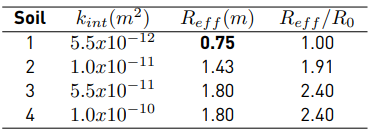 Table 6 summarizes the results of Reff obtained for the second group of simulations [Table 3]. It is noticed that Reff/R0 becomes larger as the intrinsic permeability increases. For instance, Reff increases 2.40 times when kint increases one order of magnitude (from kint=5.5x10-12 to kint=5.5x10-11 ), implying that air injection processes are more effective and faster in soils with higher saturated intrinsic permeabilities. Soils 3 and 4 reached the same Reff , indicating that there is a threshold intrinsic permeability value where no major increases in Reff are obtained.