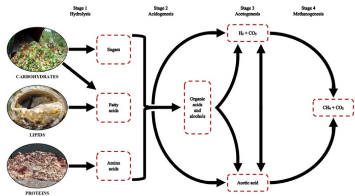 Anaerobic digestion (AD) is a process that degrades organic matter and produces biogas and a digested sludge rich in nutrients [1-3] using anaerobic microorganisms in an environment free of gaseous oxygen and at a controlled temperature [4]. AD is a technology used to eliminate waste with a high organic fraction. It also reduces odors and greenhouse gas emissions, making it an attractive method for treating organic waste and satisfying energy demand [7,8]. Biogas is mainly composed of methane (CH4, 60%-70% composition) and carbon dioxide (CO2, 30%-40% composition) [9]. Due to the microbiological nature of the anaerobic digestion process, it is essential to study the effects of different factors on the kinetics of methane yield [10-12]. In AD, the degradation process is biological and divided into four metabolic stages: hydrolysis, acidogenesis, acetogenesis, and methanogenesis [Figure 1] [13-15].