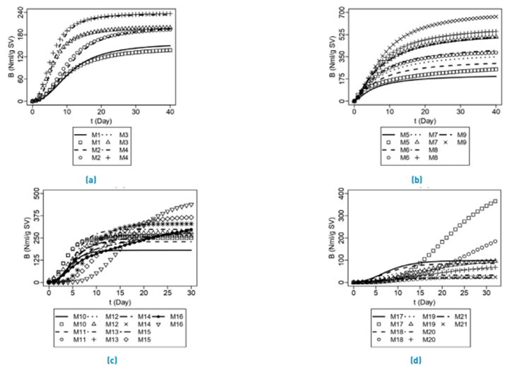In general, the investigations evaluated the methane yield kinetics by the models: exponential, modified Gompertz, Fitzhugh, Cone, and the logistic equation.