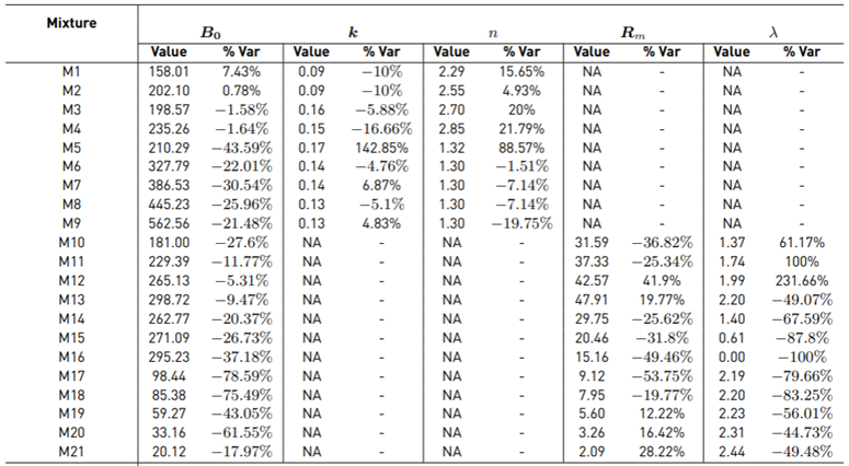 Brown [32] considers that a variation of 30% is indicative of differences; this research considered coefficient variations from 10%. Although, negative coefficients of variation denote an increase in the experimental value, the analysis depends on the physical meaning of each parameter. Whereby, negative values of the coefficients B0 , k, and Rm , refer to synergistic effects. In the case of the coefficients n and λ, negative values of the coefficient of variation indicate antagonistic effects.