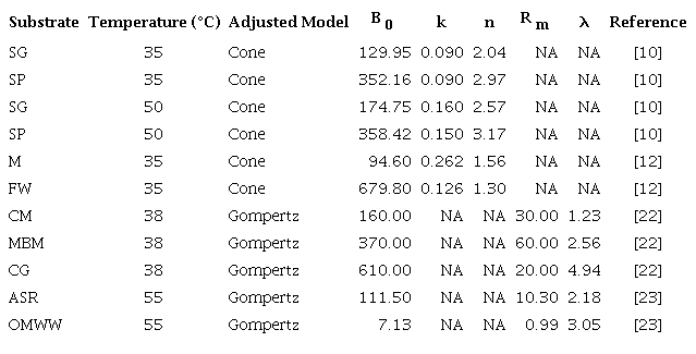 The fits of the experimental data of the substrates CM, MBM and CG [22]; ASR and OMWW [23] pointed towards the modified Gompertz model (1), unlike SG and SP [10]; M and FW [12] who pointed to Cone's model (2).