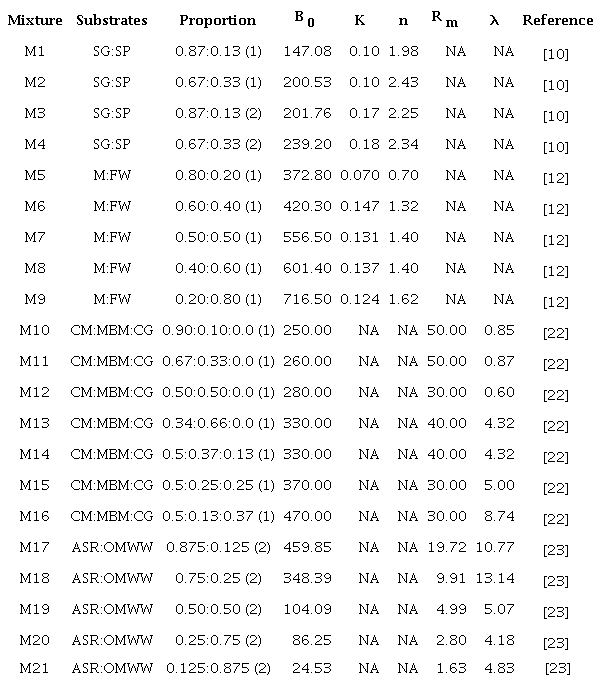 Pagés-Díaz, Pereda-Reyes [30] estimated the maximum methane yield of a mixture with the contributions of the volatile solid fractions of each substrate and their interactions. The evaluation of the methane yield kinetics of the mixtures considered a model (3) depending on the fraction provided by each substrate, and on the kinetic coefficients of each monosubstrate as mentioned by [31].