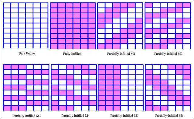 The models studied are bare frame models (100% openings) without infill; a fully infilled frame model (0% openings), plus six partially infilled frame models with 50% of chained masonry with variation of infill position in chained masonry, as shown in Figure 1. The elements constituting the frame to be analyzed are as follows: