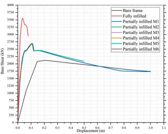 As for the partially infilled frames, their results were relatively close, which means that the random distribution of the chained masonry walls does not affect in a significant percentage the seismic performance of this type of frame. If we want to arrange these frames regarding lateral displacement, they will be as follows: first, the model M4, followed by M2, then M1, then M6, then M5, and finally M3.