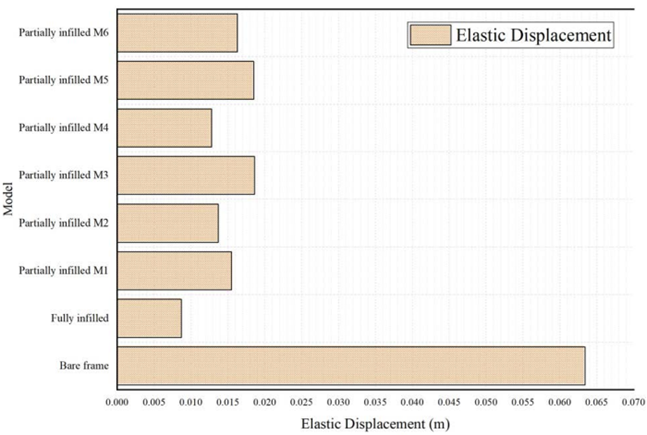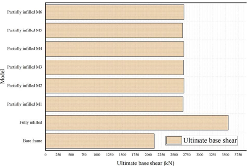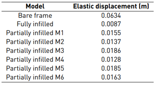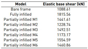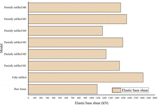 Secondly, without taking the two frames that are fully infilled and as well as the bare one, we can compare the partially infilled frames, where we can notice that the model M5 recorded the largest value for the elastic base shear compared to the rest.