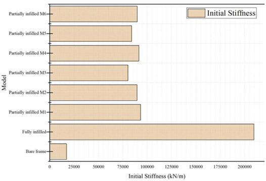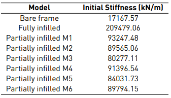 Regarding the fully infilled frame and the bare frame, we noticed that the fully infilled frame recorded the highest value of the initial stiffness as this value increased more than 12 times compared to its bare counterpart. This confirms that the presence of chained masonry infill walls in the modeling process greatly contributed to increasing the initial stiffness of the reinforced concrete frame.