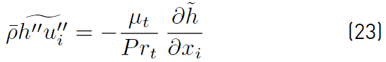 The first of the terms on the right side of Equation (22) is the Reynolds heat flux vector, which has historically been modeled using the gradient diffusion hypothesis (Equation (23)]. This model leads to the following expression for the Reynolds heat flux [32].