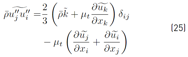 The second term of the right side of Equation (22), is the dot product of the mean velocity with the Reynolds stress tensor. It is closed based on the model chosen for the Reynolds stress tensor. The most common closures used for the Reynolds stress tensor are linear models based on the Boussinesq approximation as shown in Equation (25) [32].