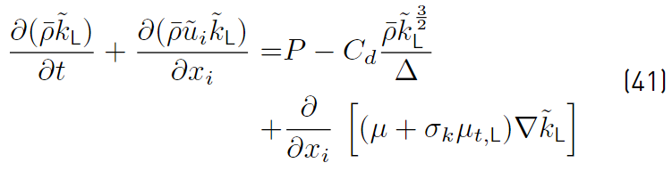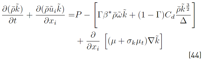 Equations (26) and 41, RANS and LES models, can be blended together (Equation (44)], resulting in the following transport equation [47]