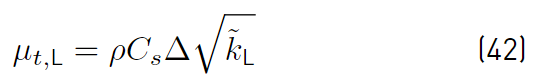 The closure problem in LES can be approached in a similar way as in RANS by defining an alternative to Equation (26). Following [48], one equation model is presented that defines the transport equation for as shown in Equation (41) (The subscript L stands for LES).