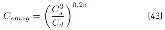 The Smagorinsky constant typically ranges from 0.065 to 0.2 and on any work, a constant value has to be assumed within the range given (Yoshizawa’s values for the constant Cs and Cd are 0.046 and 1.0 respectively). Furthermore, the value for σk = 1.0.