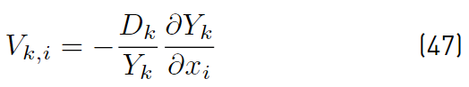 The diffusion velocity of any species k is usually evaluated from Fick’s law as shown in Equation (47) [32].