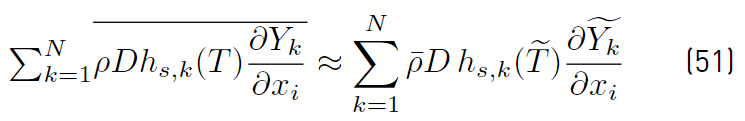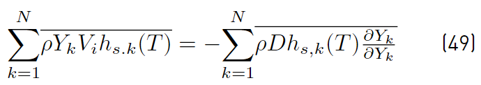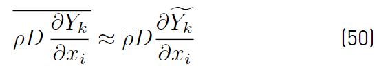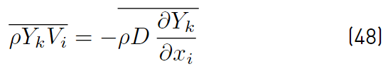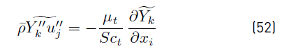 which implies that turbulent fluctuations effects are neglected on the mixture diffusivity, and conventional averages assumed equivalent to mass weighted averages. It is worth noting that the effect of temperature fluctuations on species enthalpy has to be ignored to arrive at the above expression for the averaged interspecies diffusion terms. The turbulent transport of a scalar property has always been modeled using the gradient diffusion approach. For instance, the Reynolds mass flux (Equations (52)] can be modeled as [32].