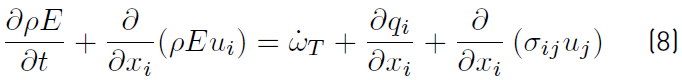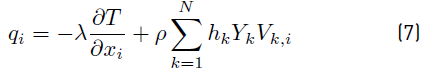and includes, first a heat diffusion term expressed by Fourier’s law and a second term associated with different enthalpies which is specific to a gas with multi-species. Viscous and pressure tensors are combined into the σij tensor (σij= τij− p δij ). External heat source terms due, for example, to an electric spark, a laser or radiation flux whose rates usually written , are not accounted. The power produced by volume forces fk on any species