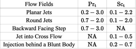 . The turbulent diffusion rates are controlled by turbulent Prandtl (Prt ) and Schmidt (Sct ) numbers. Constant values for these numbers are usually assumed in applications (in low as well as in high speed reacting flows of engineering interest), even though values for these coefficients have been shown to vary spatially [Table 2, [39])
