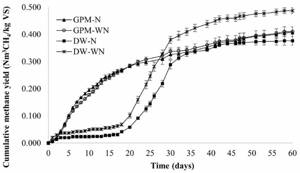 The final methane potential of the treatments showed significant differences (p < 0.001). At 60 days, the treatments with DW and inoculum had the highest methane potentials 0.671 and 0.605 Nm3 CH4/kg VS for the treatments CM + GPM + DW + I and CM + DW + I, respectively; followed by treatments CM + GPM + I, CM + GPM + DW and CM + I; and finally, the treatments with the lowest methane potential were CM, CM + GPM and CM + DW. Comparing the experimental and theoretical BMP of treatment CM + GPM + DW + I, 69.07% of the theoretical BMP was produced experimentally, significantly higher than the percentage obtained individually for CM and DW, 43.81% and 34.49%, respectively. However, for individual GPM, the experimental BMP was 78.38% of the theoretical, higher than the theoretical BMP percentage obtained for the mixture of all substrates.