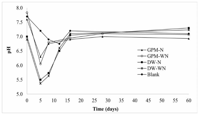 The methane production started almost equally for GPM and DW, but after day 3, it increased very rapidly for GPM, while for DW, it seemed to stop [Figure 1]. This behavior coincided with a drop in pH, which was more severe for DW [Figure 2]. On day 8, it was observed that the pH for the treatments with GPM increased up to 6.8 while for the treatments with DW remained below 6.0; therefore, for DW the pH was adjusted to neutrality. However, in spite of pH adjustment for DW treatments, the methane production did not increase until day 18 of the experiment. From that point onwards, the methane production recovered to levels comparable to that of GPM.