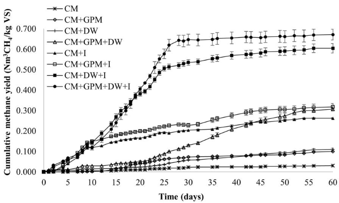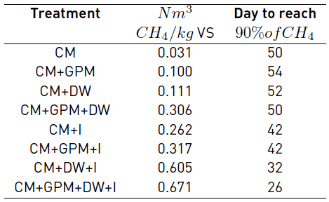 The highest methane potentials obtained for the treatments CM + GPM + DW + I and CM + DW + I are close to that reported in [34], where a value of 0.590 Nm3 CH4/kgVS for codigestion of cattle manure with glycerin was reported. These potentials are also close to the upper range reported in [6], from 0.18 to 0.6 Nm3 CH4/kgVS for CM with different substrates. However, the potentials obtained are lower than the methane potential observed in [38] for livestock manure from western and eastern Europe and North America, with values of 1.000 and 0.908 Nm3 CH4/kgVS.