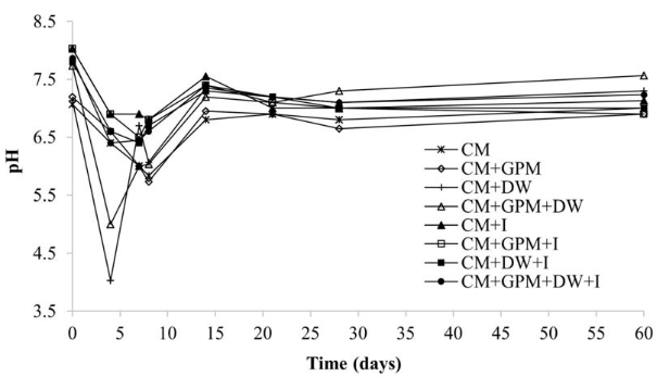 These advantages were reflected in the rapid onset of methane production in treatments with inoculum since hydrolysis is the first step of AD, and its proper development facilitates the following stages to proceed until methane production [32]; in addition, the time in which 90% of methane was obtained was lower for all the treatments that contained inoculum, with differences in the range of 8 to 24 days for the treatments that contained CM and CM+GPM+DW, respectively; finally, none of the treatments that contained inoculum presented risk of acidification. Nonetheless, in many cases, the digestion of cattle manure is carried out without the addition of any inoculum, as reported in [33]. The reason for this is that the cattle manure contains anaerobic microorganisms; thus it could be used as substrate and inoculum. However, the disadvantage of not using inoculum is that a long lag phase can be experienced at the start of the process, as observed in the present experiment.