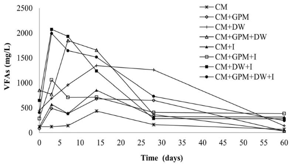 In the treatments with the highest methane production (CM + GPM + DW + I and CM + DW + I),VFAs increased until day 3; after this, they decreased gradually until the end of the experiment [Figure 5], following a normal batch AD process [30]. For treatments containing inoculum and DW, the production of VFAs during the first days of the process was significantly higher than the other treatments, meaning that DW, as co-substrate, contributed with components of easy degradation, while the inoculum provided necessary hydrolytic and acidogenic microorganisms to guarantee VFAs production. The results showed that the VFAs produced were effectively consumed during the digestion process in the inoculum and DW treatments.