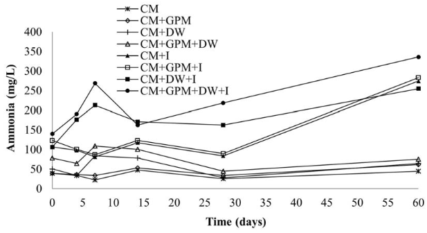 In suitable concentrations, ammonia is used as a nutrient for bacterial growth, but if found in high concentrations, it can become toxic. In AD, high levels of ammonia affect the production of methane by inhibiting methanogenic microorganisms. For this reason, in the present research, this parameter was followed, founding differences in the treatments with and without inoculum Figure 6. Throughout the process, the ammonia values for the treatments without inoculum were maintained in the range of 22-110 mg/L, with concentrations considered to be beneficial for the AD process (below 200 mg/L). In contrast, for treatments with inoculum the ammonia concentration reached values above 200 mg/L, especially for the treatments containing DW (CM + DW + I and CM + GPM + DW+ I). In the treatments with inoculum and without DW (CM + I and CM + GPM + I), the concentrations of ammonia only exceeded 200 mg/L at the end of the process. Some authors suggest even lower values to guarantee the stability of the process, stating that although the concentration of ammonia that can cause inhibition depends on the type of substrate, type of inoculum, and environmental conditions such as temperature, pH and the acclimation periods [39], concentrations of ammonia higher than 150 mg/L are considered inhibitory [41]. However, ammonia contributes to buffering capacity, since it has the ability to react with VFAs, neutralizing them, avoiding inhibition by the accumulation of VFAs and favoring the production of biogas [39].