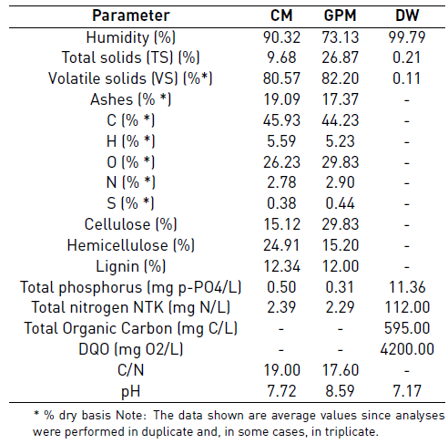 Characterization of substrate, co-substrates and inoculum, as well as the control parameters, were performed according to the standard methods [15], as follows: VFAs (5560 C. Distillation method), ammonia (4500-NH3 E. Titration method), alkalinity (2320B. Titration method), pH (pH meter), Chemical Oxygen Demand (COD) (5220 D. Closed reflux, colorimetric method), ST (2540 B. Total solids dried at 103-105 °C), SV (2540 E. Fixed and volatile solids incinerated at 550 °C), Total Kjeldahl Nitrogen (TKN) (4500-Norg.B. macro-Kjeldahl method). Cellulose, hemicellulose, and lignin were determined by the Van Soest method through the procedures of neutral detergent fiber, acid detergent fiber, and acid detergent lignin. For methane content, the volumetric method was carried out, according to the literature [16]. Chromatographic analyses of biogas were made in a SHIMADZU GC17A gas chromatograph, column: DB-WAX (Agilent Scientific, 30 m x 0.25 mm x 0.25 μm), Detector: FID at 280 °C, Injector: split/splitless at 250 °C. Injection split 1:10 and mobile phase: Helium AP at 1.0 ml/min. Before analyzing the results, biogas production data were converted to normal conditions (temperature of 0°C and 1 atmosphere of pressure). For CM and GPM, the theoretical BMP was calculated based on the elemental composition developed in [17] using Equations 1 and 2 [18]; for DW, it was calculated assuming that the consumption of 1 g of COD corresponds to 350 mL of methane at standard temperature and pressure using Equation 3 [18].