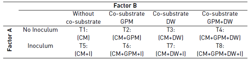 In order to determine the effect of inoculum and co-substrates on the methane potential of CM, 8 treatments were evaluated. The treatments were organized in a factorial structure (2*4) with a completely randomized design with three repetitions. The inoculum had two levels: with and without inoculum; and the co-substrate had four levels: without co-substrate, co-substrate GPM, co-substrate DW, and the co-substrate GPM + DW [Table 2]. In treatments 2, 4, 6 and 8, it was used a CM:GPM ratio of 7:3 in terms of VS, which was defined considering the average amount of recoverable CM and GPM generated in the farms in the study area but keeping the CM as the main substrate. In treatments 1, 2, 5 and 6, the effective volume was completed with distilled water. In treatments 3, 4, 7, and 8, the effective volume was completed with DW to maintain the substrate concentration of 2 g VS/L.