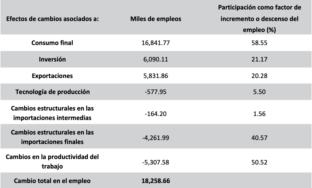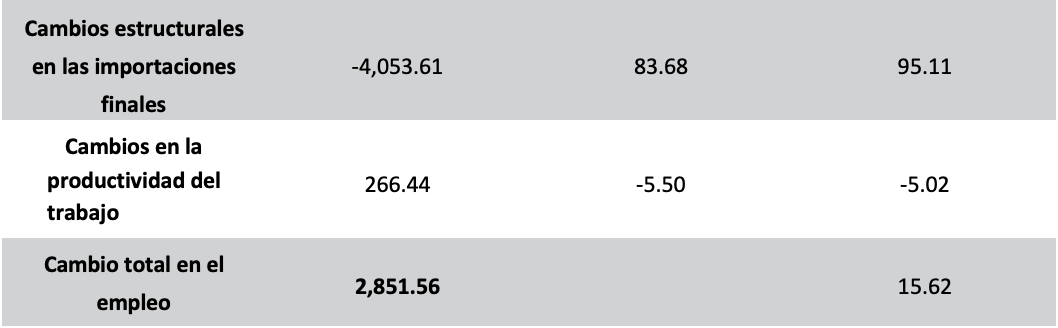 Los cambios en la tecnología de producción, en las importaciones intermedias y finales, así como los cambios en la productividad del trabajo, se asociaron a cambios negativos (o aquellos que se asociaron con disminuciones en el empleo) sobre el empleo en el periodo. Entre estos factores con efecto negativo, sobresalen los cambios en la productividad del trabajo (50.5 % del total del efecto negativo sobre el empleo) y los efectos asociados a las importaciones intermedias e importaciones finales 1.56% y 40.5% del efecto desfavorable sobre el empleo respectivamente. El resto del cambio negativo en el empleo se explica por los inventarios con una participación de 1.84% en el efecto negativo total.