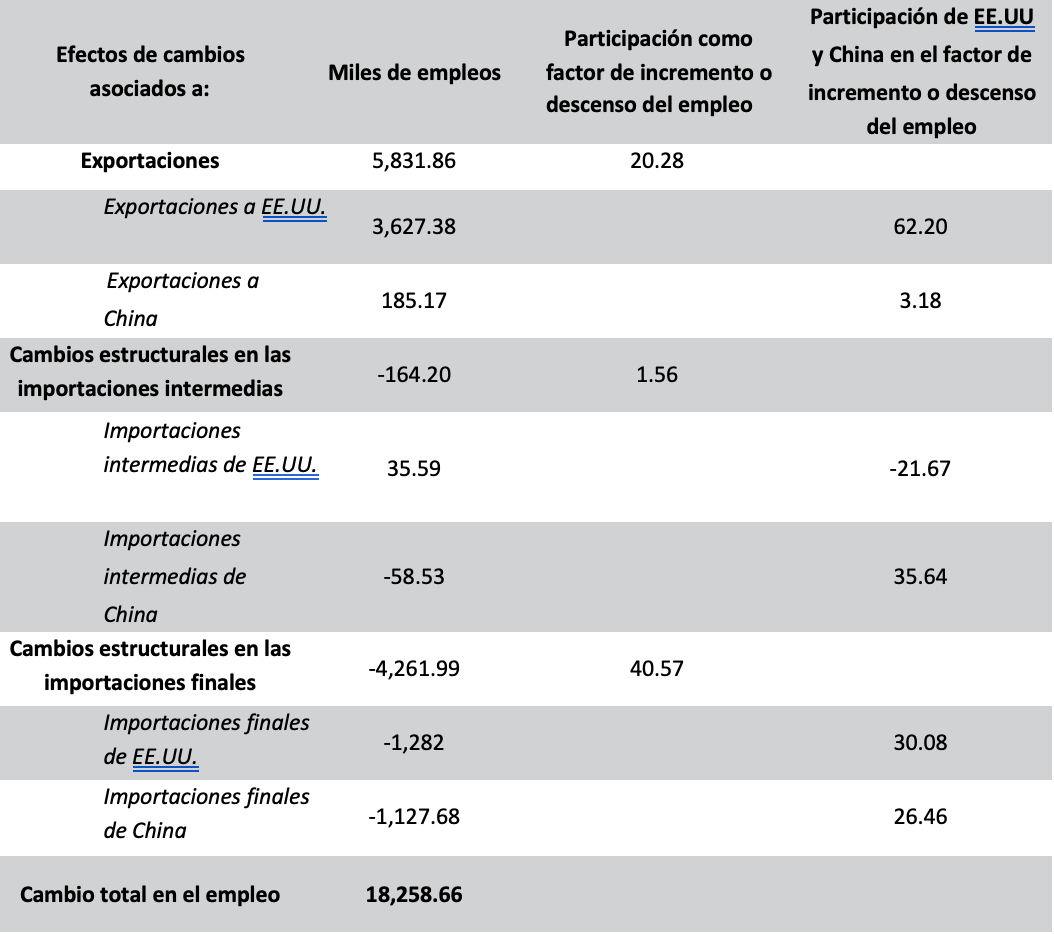 De esta manera, con base en las MIP de la WIOD y de la OCDE se mantiene la concentración del efecto positivo de las exportaciones en aquellas dirigidas a EE.UU. mientras las importaciones intermedias y finales provenientes de China aportan buena parte de los efectos negativos en el empleo.