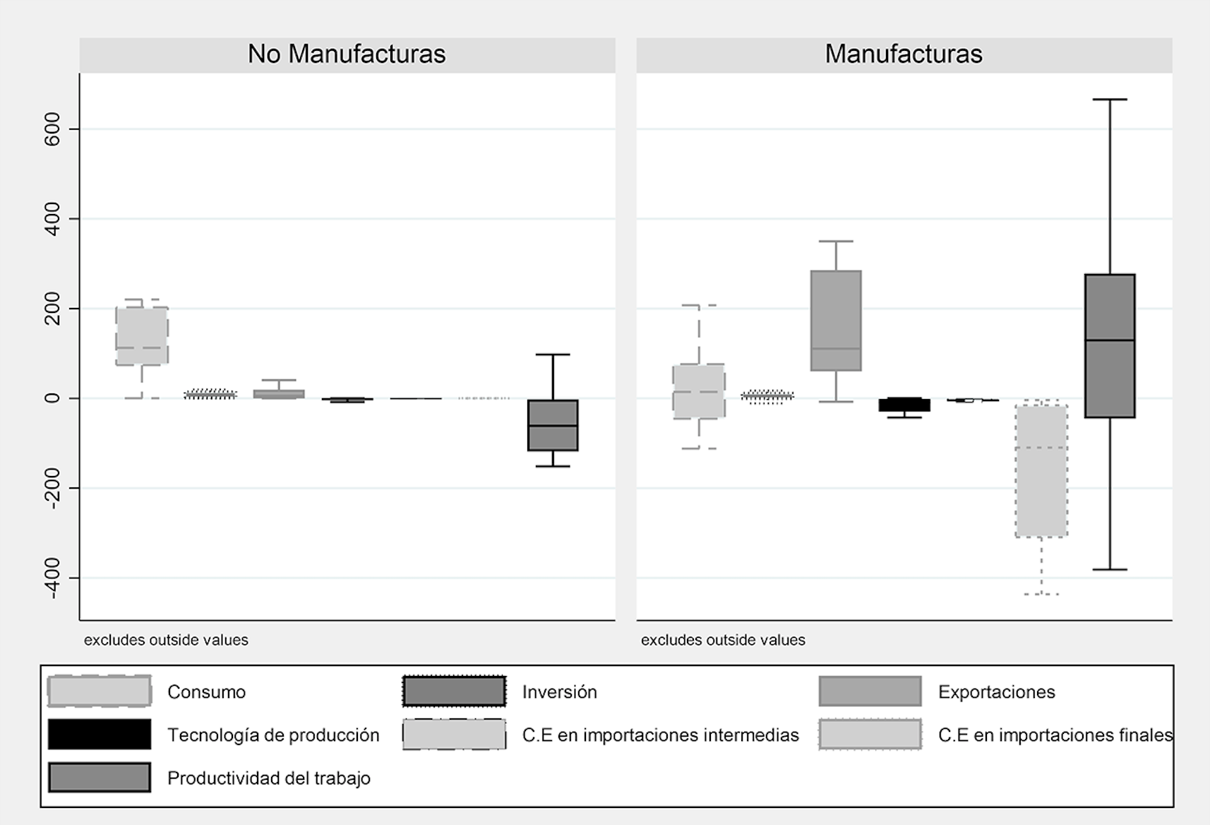 Por otra parte, en el conjunto de las actividades manufactureras, la contribución de los factores de cambio estructural difiere de lo observado en el total de la economía. Si bien los efectos asociados al consumo e inversión operan en la misma dirección, en las manufacturas su contribución al efecto total positivo es menor al ubicarse en 33.29% y 6.52% respectivamente. El efecto asociado a las exportaciones gana importancia y se ubica en 56.73%. La contribución de los cambios estructurales en las importaciones intermedias y en las importaciones finales también mantienen el efecto negativo en el empleo manufacturero, pero éstas se incrementan a 2.53% y 83.68% respectivamente.