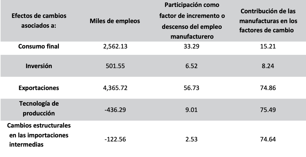 En el empleo manufacturero, el examen señala que las exportaciones son el principal factor con efecto positivo (56.73%) seguido del consumo final (33.29%). Por el contrario, las importaciones finales concentran el efecto negativo (83.68%). También sobresale que las manufacturas contribuyen con 74.86% del efecto positivo de las exportaciones y 95.11% del impacto negativo de las importaciones finales en el cambio en el empleo. No obstante que las manufacturas aportaron sólo 15.62% del incremento en el empleo entre 1995 y 2011, hay que destacar que concentran el efecto positivo asociado a las exportaciones como los efectos negativos relacionados con las importaciones intermedias y finales.