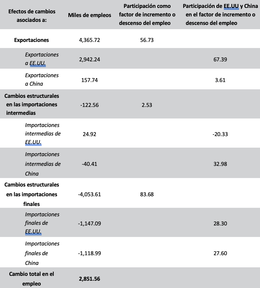 Al concentrarnos en los efectos de cambios asociados a las exportaciones manufactureras con destino a EE.UU. éstas aportan 67.39% del efecto total positivo sobre el empleo manufacturero. Las exportaciones manufactureras dirigidas a China tienen también un efecto positivo de 3.61% del efecto total de las exportaciones manufactureras sobre el empleo.